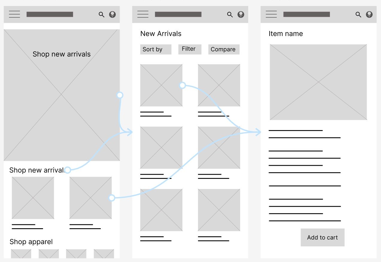 I created digital wireframes in Figma for each of the major pages, including the New arrivals page (see below). I used a mobile-first approach, creating the mobile designs first and then the desktop ones.