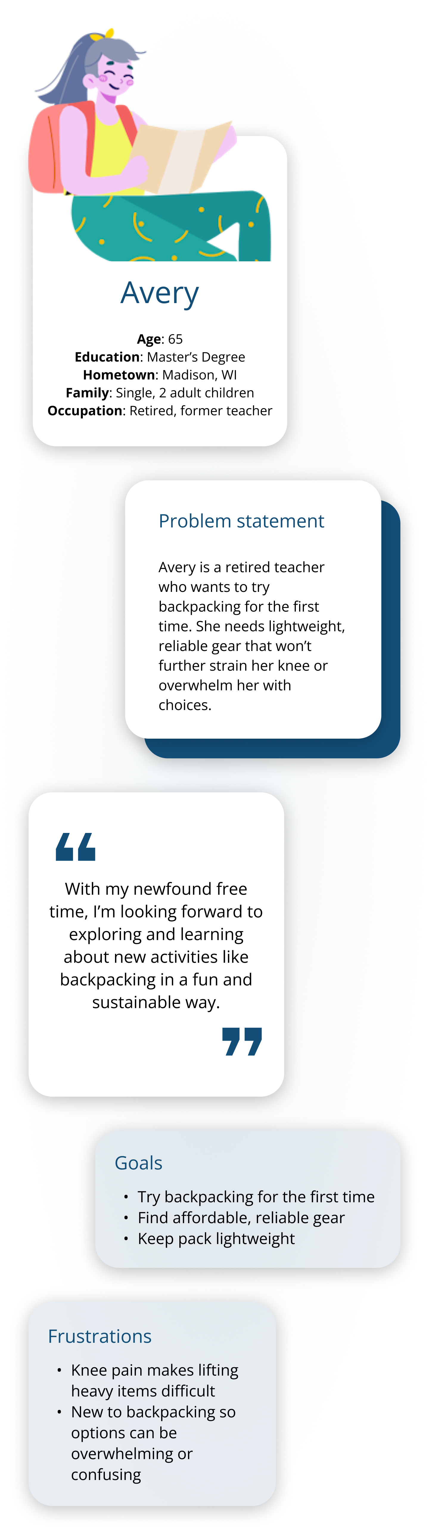 I conducted market and competitive research to better understand the camping supply space and identify common user experiences, features, and products. For user research, I interviewed individuals from my own network, creating as representative of a sample as possible given the hypothetical nature of this project. While this method has its limitations, it provided valuable insight into user goals, pain points, and motivations.