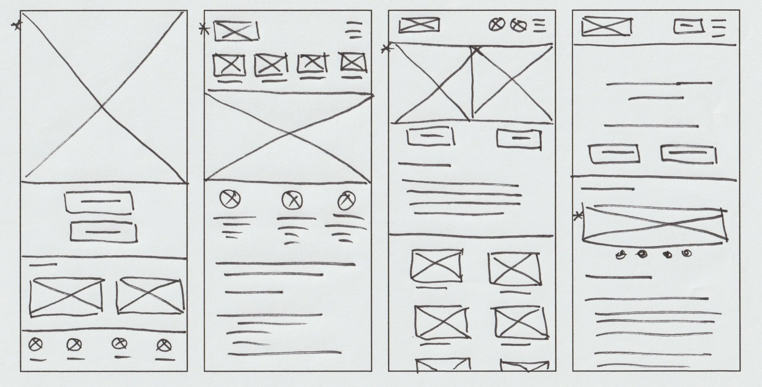 I started by sketching a variety of ideas for the homepage design. I experimented with placement and formatting, selecting the best elements and refining them down to one wireframe. This process was repeated for each page so they would be ready to be turned into digital wireframes.